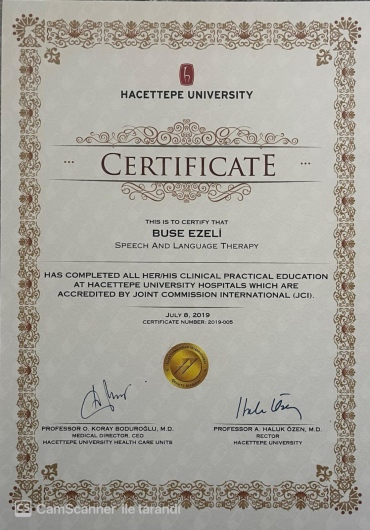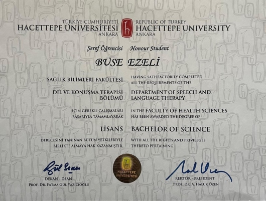 - Hacettepe Üniversitesi Dil ve Konuşma Terapisi Bölümü (Ankara 2015-2019)