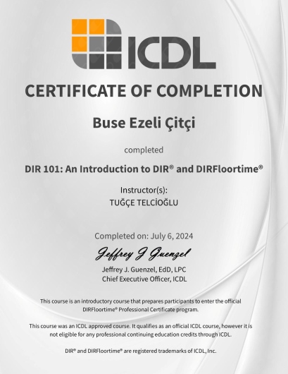 Ulusal ve uluslararası düzeyde çeşitli eğitim ve sertifika programlarına katıldım. Aldığım başlıca eğitimler arasında DIR Floortime, TEDİL ve TODİL gibi dil gelişimi testleri, pediatrik motor konuşma bozuklukları terapisi ve etkileşim temelli erken müdahale programları yer alıyor. Ayrıca, otizm spektrum bozukluğu değerlendirme ve gelişimsel tarama konularında uzmanlık kazandım.